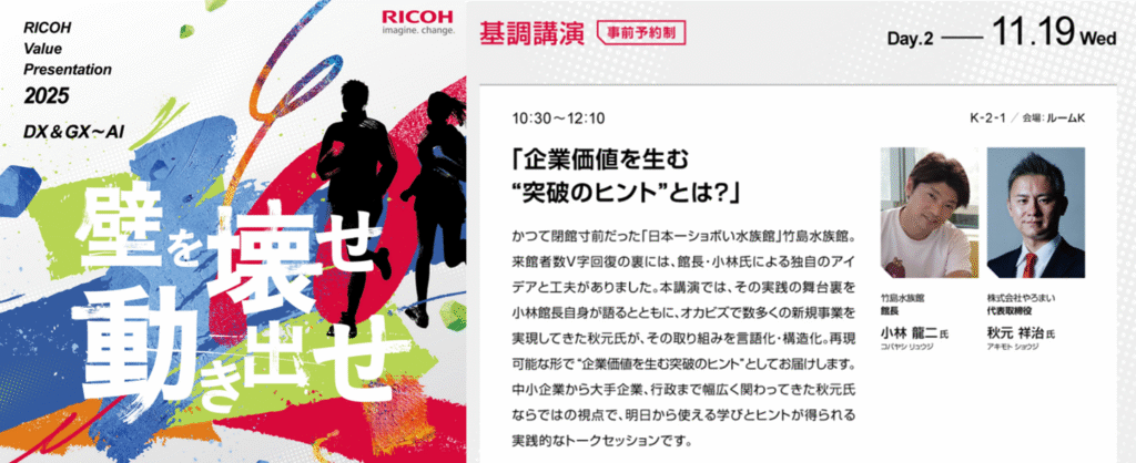 リコージャパン株式会社が主催する顧客向けイベント「RICOH ValuePresentation2025」にて、竹島水族館の小林館長とともに登壇いたします。