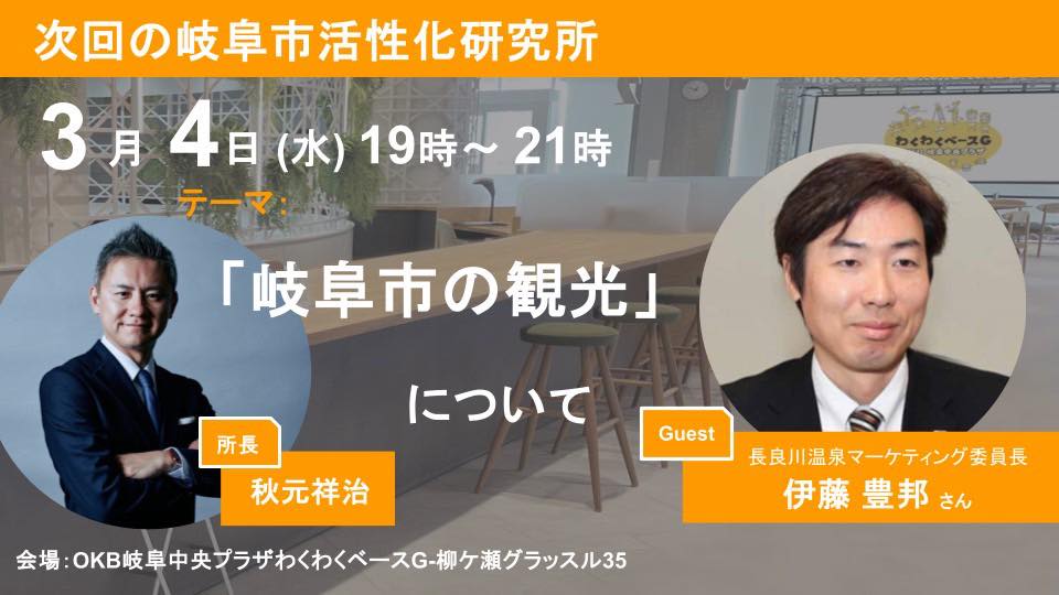 岐阜市の「観光」をテーマに行います。私自身、これからの岐阜市の次の産業振興のコアエンジンは観光だと思っていて、より本物より適切な価格でいかに届けていくのか。このあたりぜひじっくりとお話を聞いていきたいと思います、一緒に学びませんか?一見さん、はじめての方、もちろんウェルカムです。
